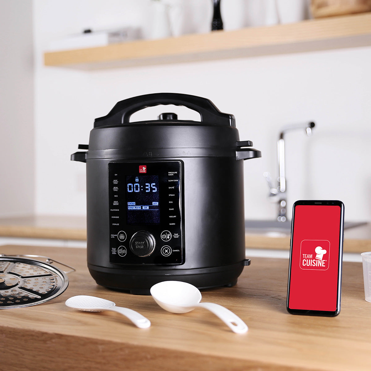 Der Smarte Schnellkochtopf kann mit einem mobilen Gerät verbunden werden und über die TEAM CUISINE SMART App via WLAN leicht aus der Ferne gesteuert werden - auch wenn du gerade nicht in der Küche bist.