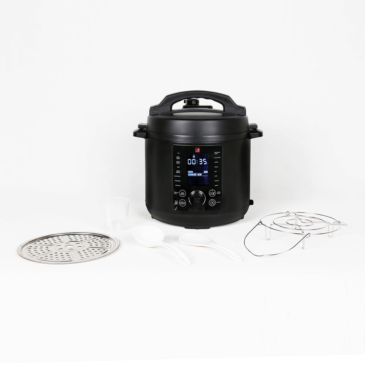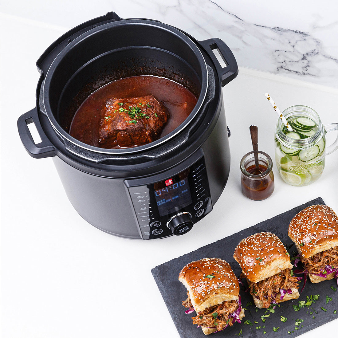 Über das LED-Display kann Druck, Zeit und Temperatur eingestellt werden. Der Smart Pressure Cooker verfügt über einen Soft-Touch-Drehknopf zum Einstellen der verschiedenen Funktionen und bietet 6 Liter Fassungsvermögen. Der Multikocher gibt ein akustisches Signal aus, wenn der Schnellkochtopf vorheizt, Einstellungen geändert werden oder der Kochvorgang beendet ist.